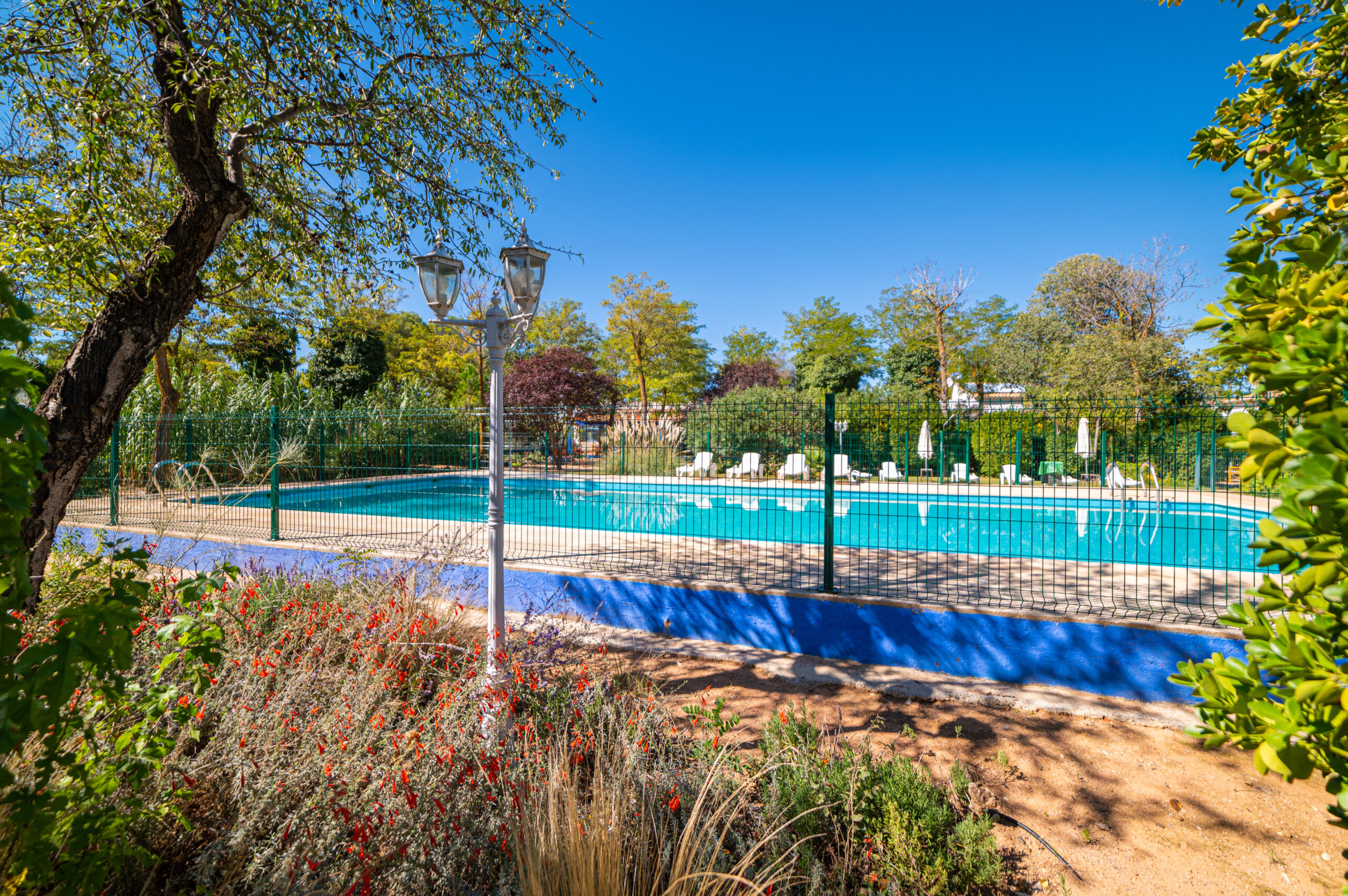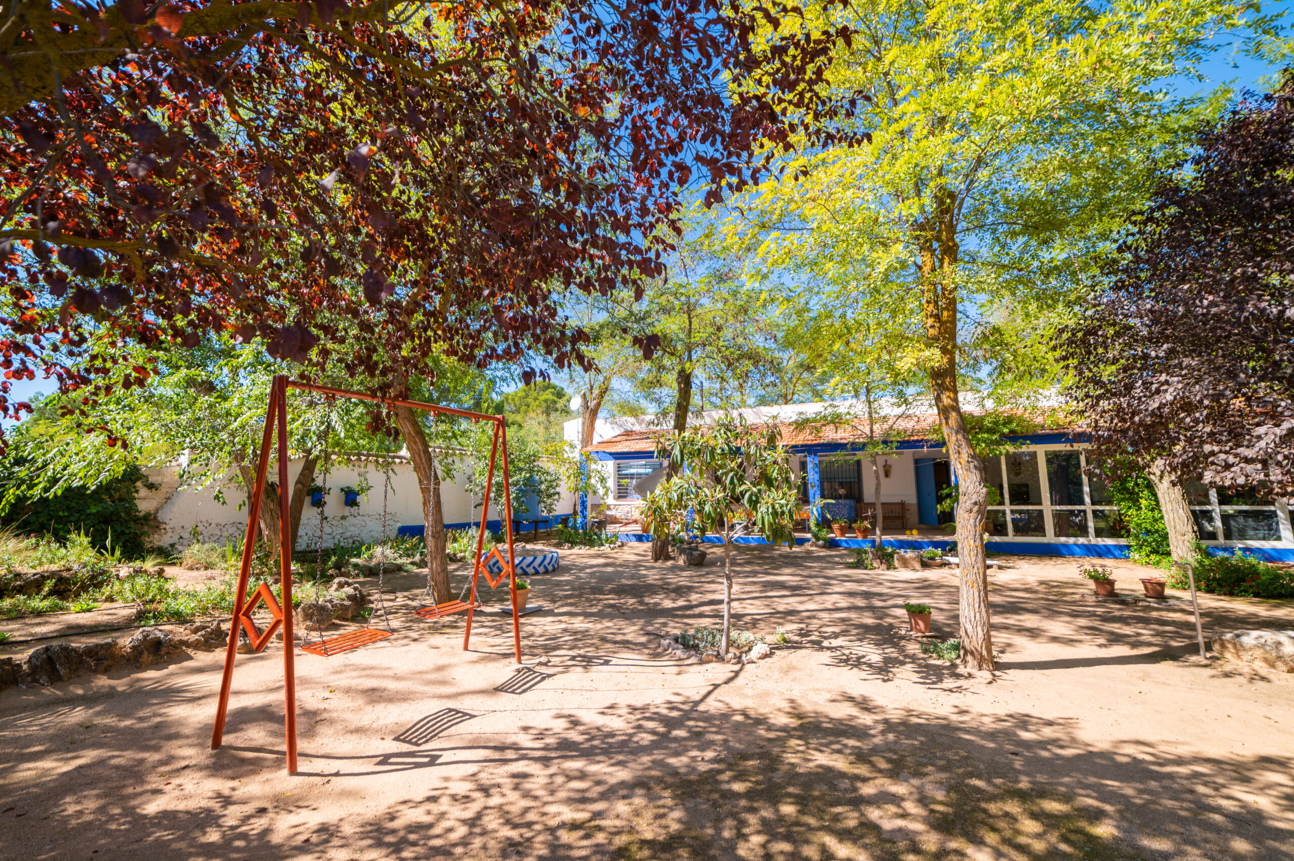 Amplios jardines y zonas de sombra dentro de una finca de 8.000m², con zona infantil con columpios y canasta de baloncesto.
