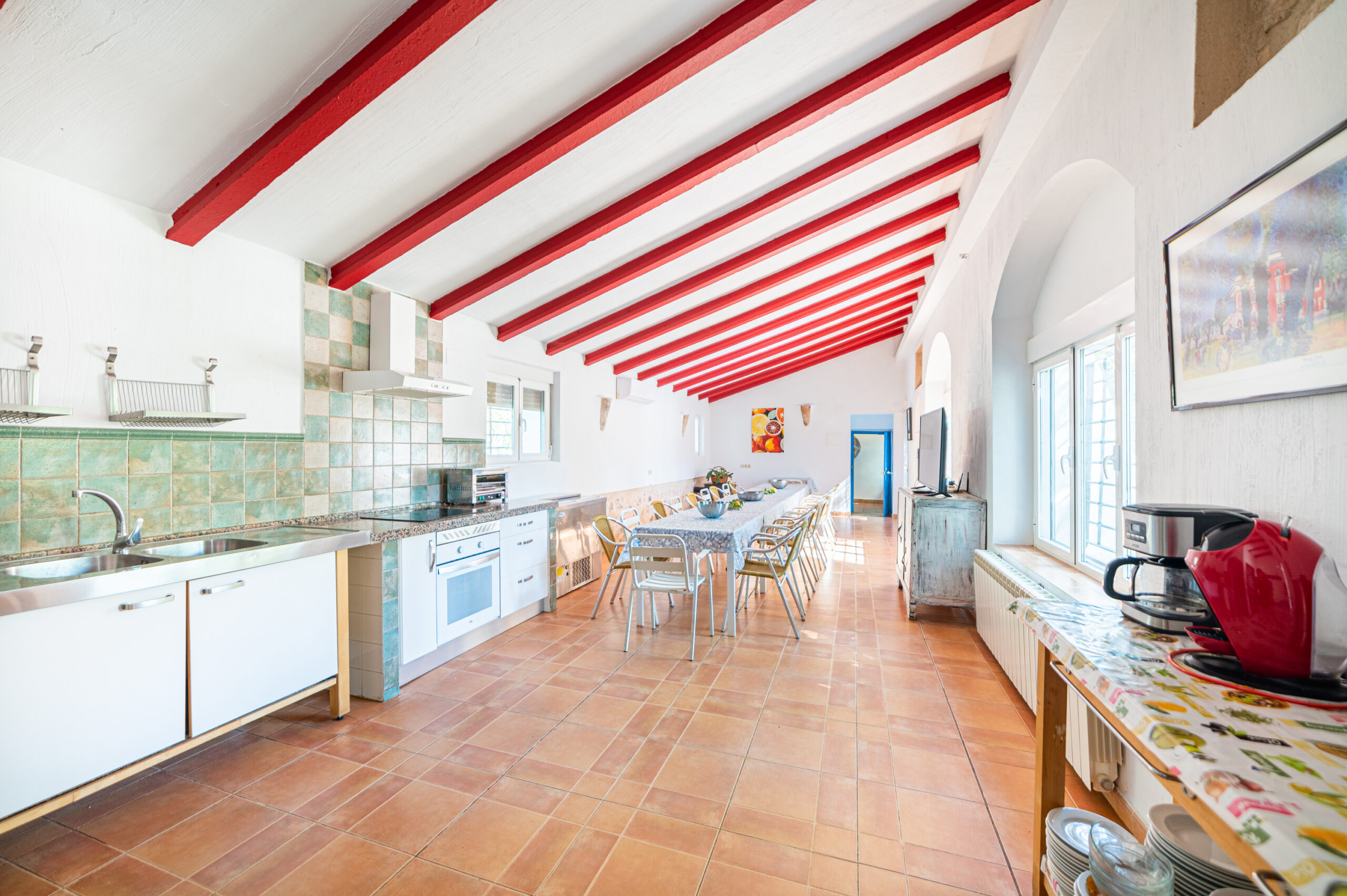 Cocina-comedor con zona de estar de 85, un espacio amplio y cómodo con 2 TV 55″ y sofás, perfecto para vuestras reuniones.